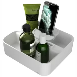 Avec ce support de douche de la série Tiger 2-Store, vous pouvez facilement créer plus d’espace de rangement dans votre cabine de douche derrière la paroi en verre. Le panier de douche se fixe facilement à la paroi en verre. Une protection en silicone empêche les rayures. De cette façon, vous avez une zone de stockage sèche et humide. Il y a aussi un support de téléphone universel dans la zone sèche, afin que vous puissiez profiter de votre musique pendant la douche. Le support en plastique a un look moderne avec un fond plat et un bord haut. De plus, il est équipé de deux crochets à serviettes pratiques. Ce panier de douche durera longtemps.